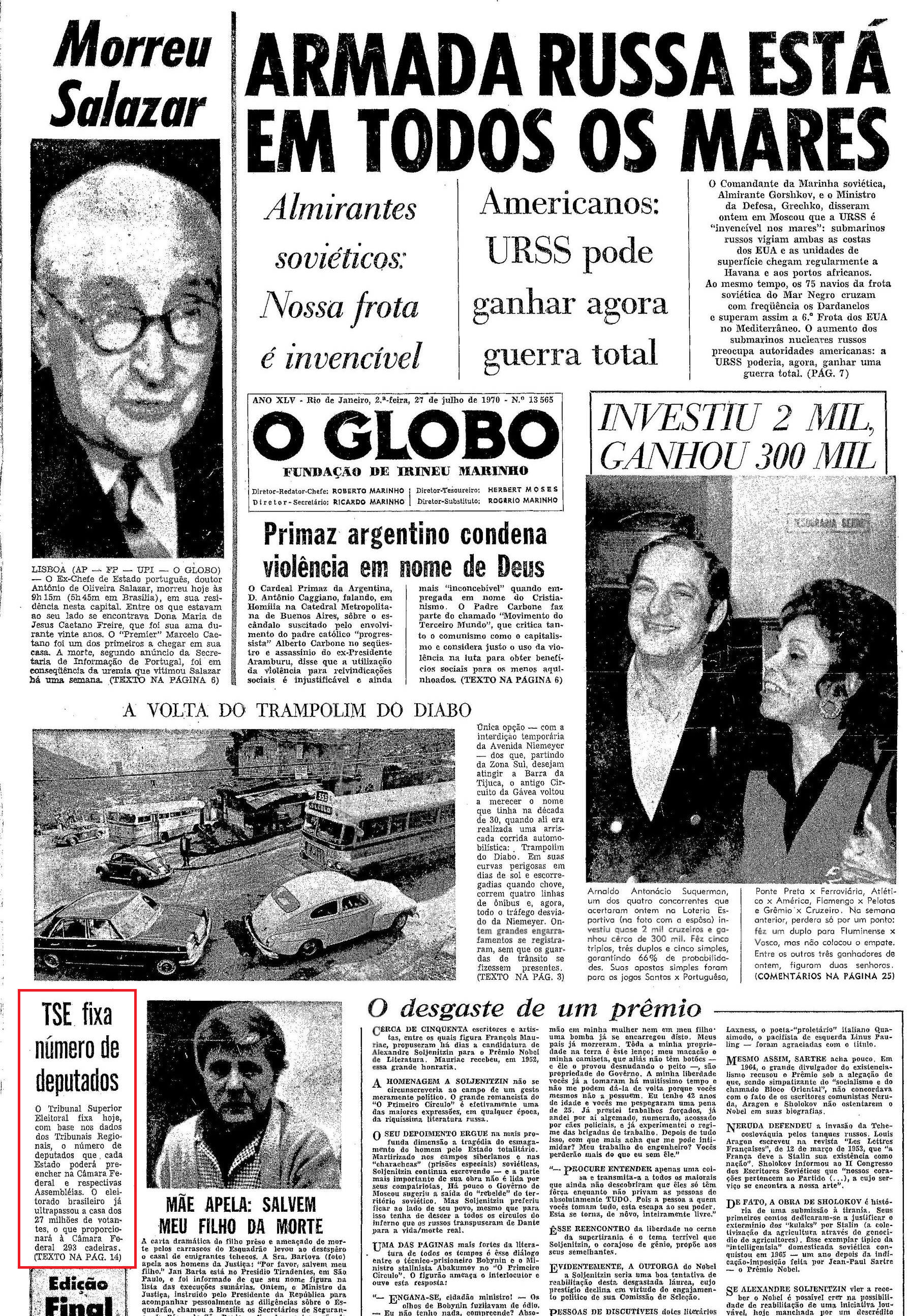 Há 46 anos, no dia 27 de julho de 1970, o TSE fixou, com base nos dados dos Tribunais Regionais, o número de deputados que cada Estado poderia preencher na Câmara Federal e nas respectivas Assembleias.