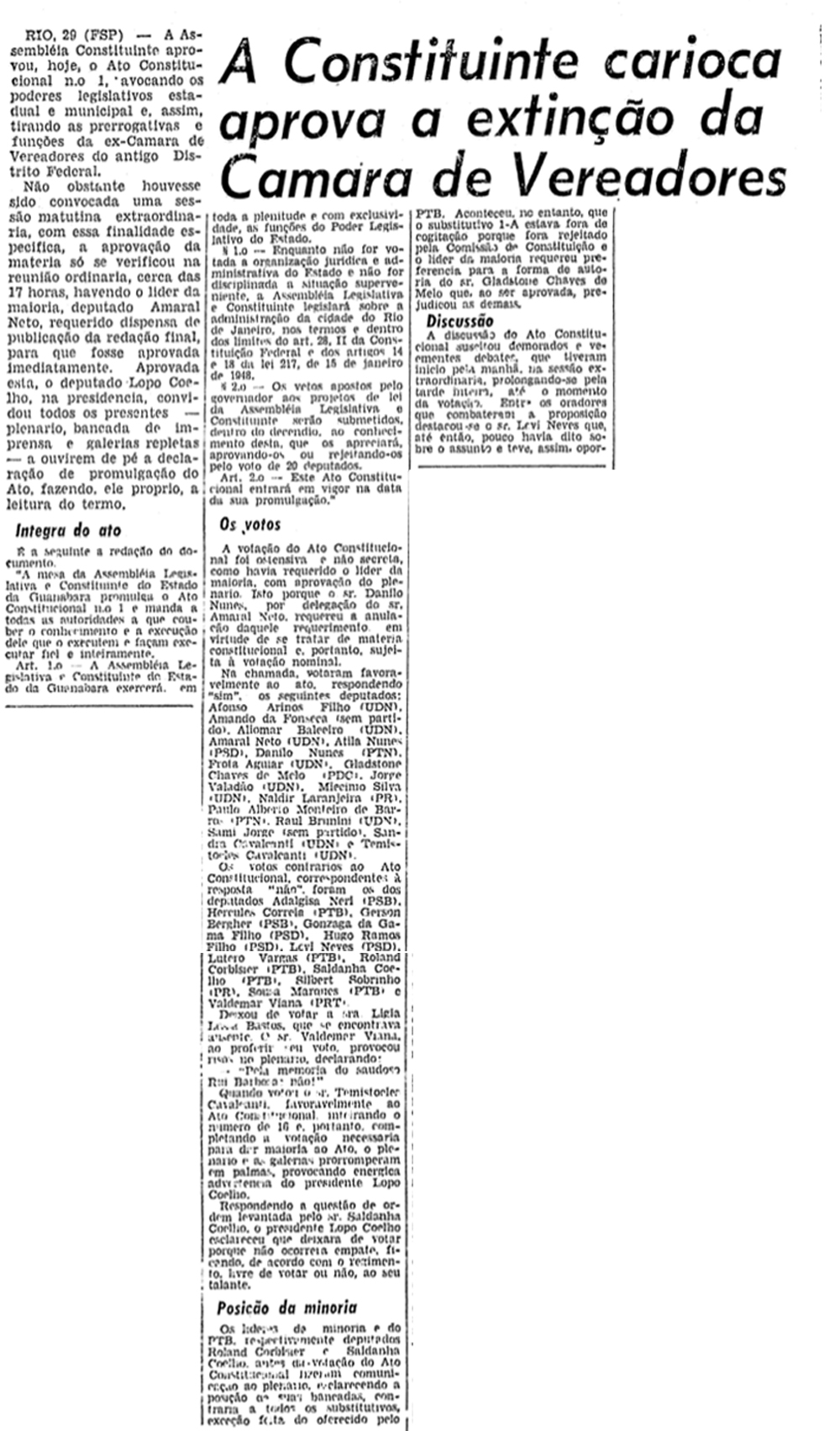 Há 57 anos, no dia 29 de dezembro de 1960, a Assembleia Constituinte do RJ retirou as prerrogativas e funções da Câmara dos Vereadores do antigo DF e assumiu as funções legislativas do Estado.
