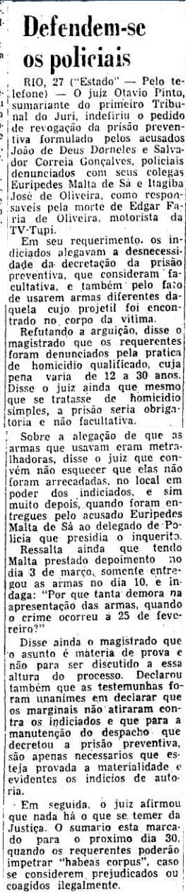 Há 59 anos, no dia 27 de abril de 1959, o juiz Otavio Pinto, do 1º tribunal do Júri do RJ, indeferiu o pedido de revogação da prisão preventiva de João de Deus Dorneles e Salvador Correia Gonçalves, policiais denunciados como responsáveis pela morte de Edgar Faria de Oliveira, motorista da TV Tupi.
