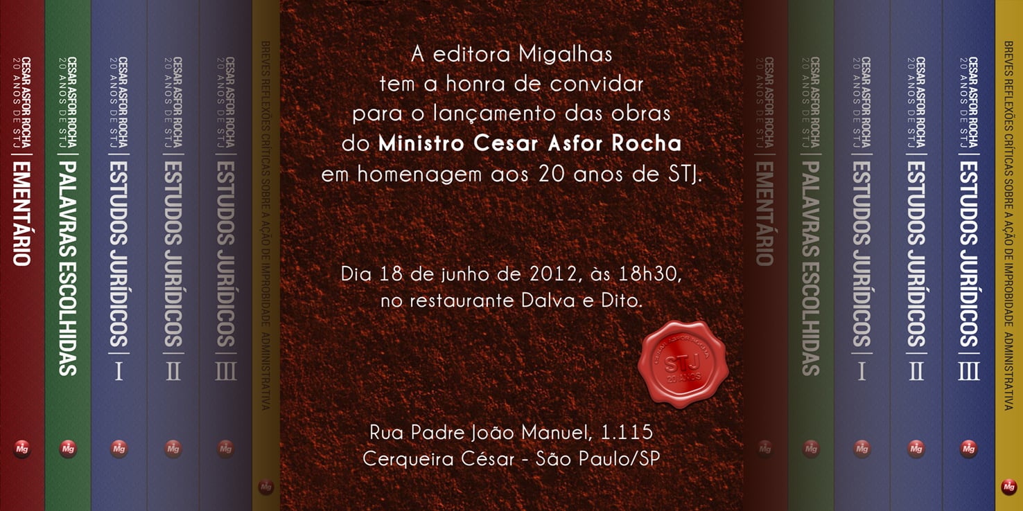 No próximo dia 18, em SP, acontece o lançamento de seis obras em homenagem aos 20 anos de STJ do ministro Cesar Asfor Rocha. O evento será no Restaurante Dalva e Dito (Rua Padre João Manuel, 1.115, Cerqueira César, São Paulo/SP), às 18h30.