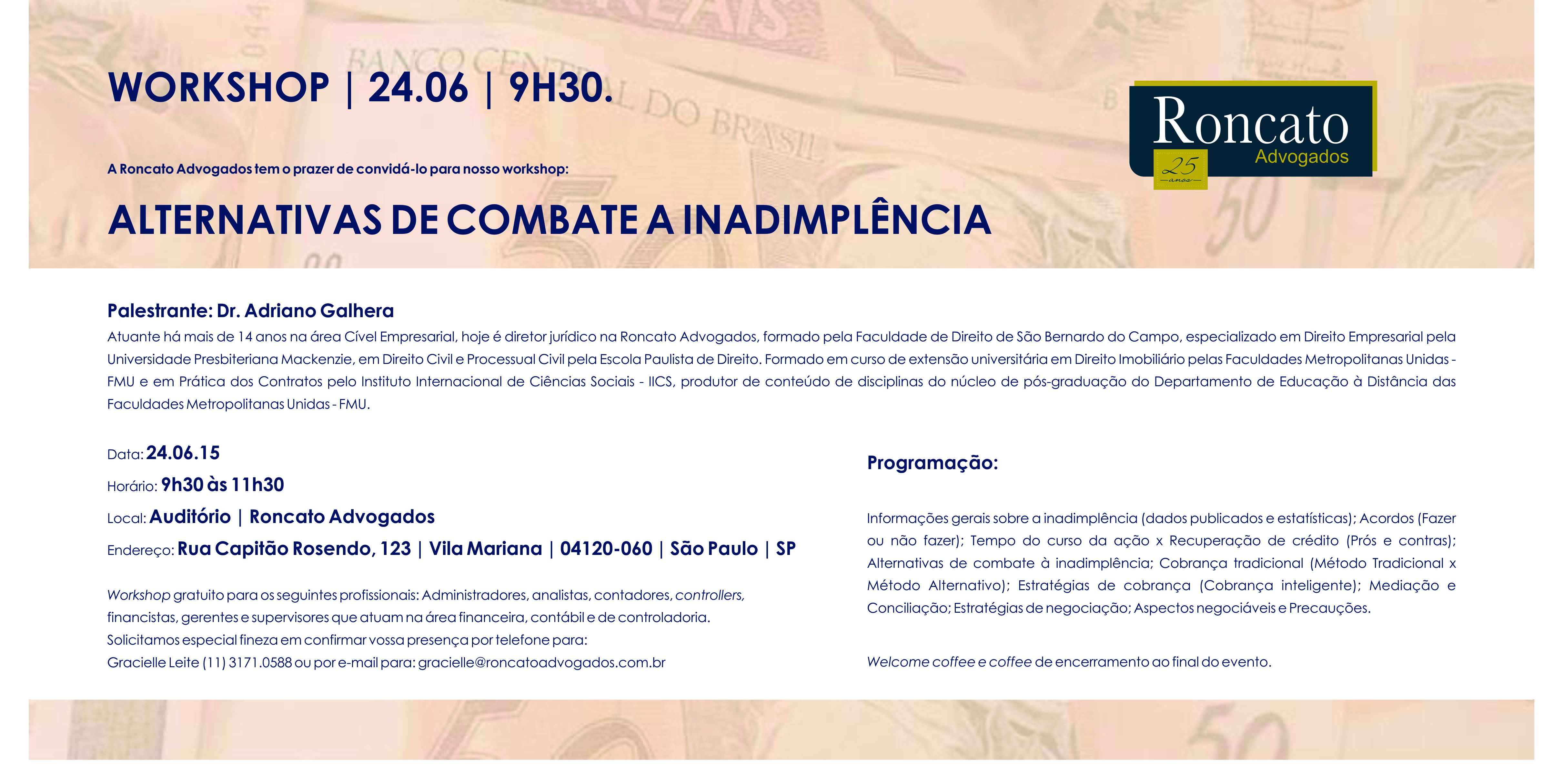 • Local: Auditório Roncato Advogados (Rua Capitão Rosendo, 123, Vila Mariana, SP)