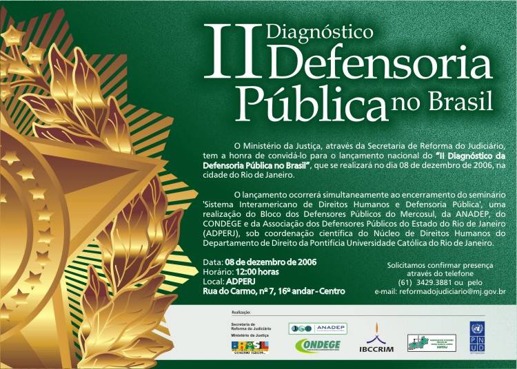 O Ministério da Justiça, através da Secretaria de Reforma do Judiciário, tem a honra de convidá-lo para o lançamento nacional do "II Diagnóstico da Defensoria Pública no Brasil", que se realizará no dia 8/12, na cidade do Rio de Janeiro.