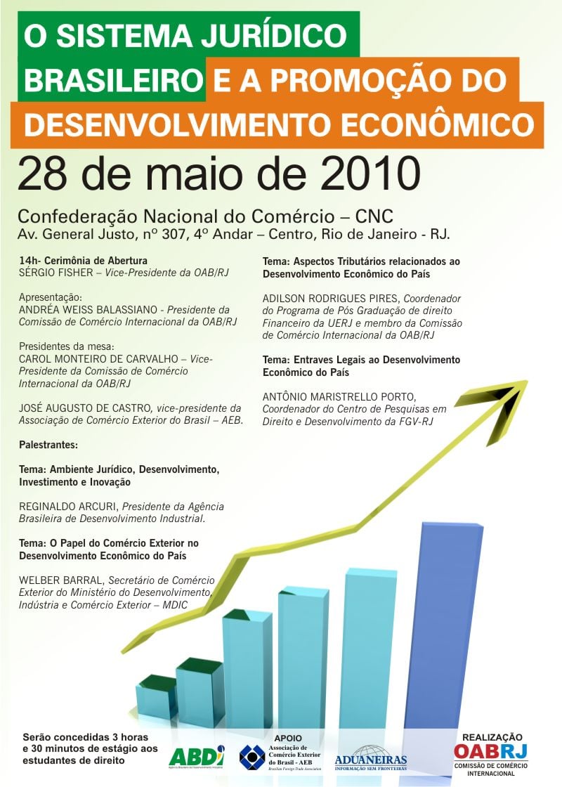 No dia 28/5, o Ministério do Desenvolvimento, Indústria e Comércio Exterior promove o seminário "O Sistema Jurídico Brasileiro e a Promoção de Desenvolvimento Econômico", na sede da Confederação Nacional do Comércio, no RJ. (Clique aqui)