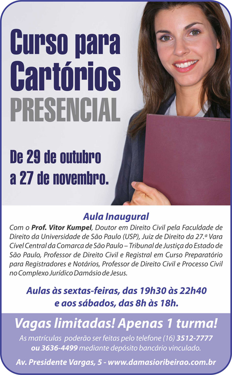 O professor Vitor Kümpel, do Vitor Kümpel Cursos Jurídicos, dará a aula inaugural do "Curso para cartórios - presencial", que acontece de 29/10 a 27/11 em Ribeirão Preto/SP. (Clique aqui)