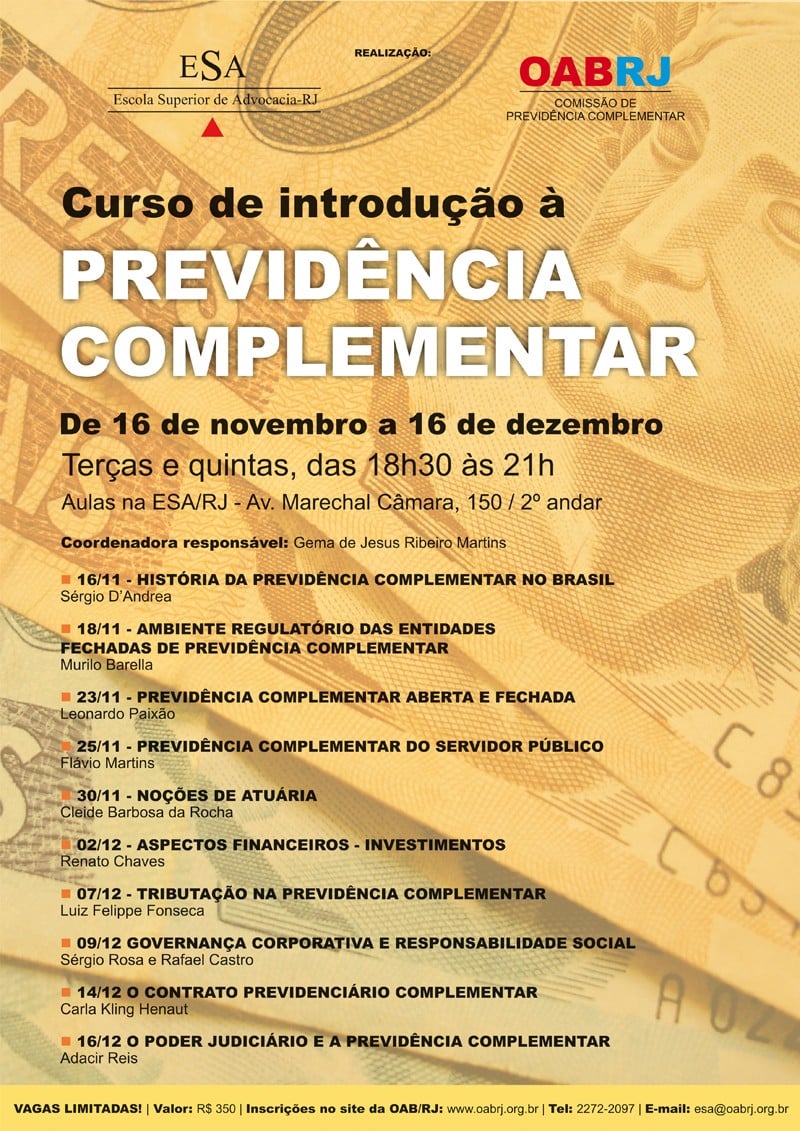 A partir do dia 16/11, a ESA da OAB/RJ promove o "I Curso de Introdução à Previdência Complementar". As vagas são limitadas. (Clique aqui)