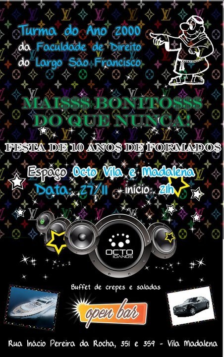 No dia 27/11, a turma de 2000 das Arcadas realizará festa de 10 anos de formatura. O encontro, organizado pelos integrantes Alison Francisco, Guilherme Ferreira e Fabia Vecoso, será no Espaço Octo Vila e Madalena, a partir das 21h. (Clique aqui)