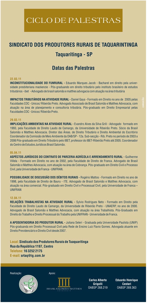 Amanhã, o advogado Guilherme Villela, do escritório Brasil Salomão e Matthes Advocacia, ministrará a palestra "Aspectos Jurídicos do Contrato de Parceria Agrícola e Arrendamento Rural", no Sindicato Rural de Taquaritinga/SP. Informações : (16) 3252-2175 ou clique aqui.