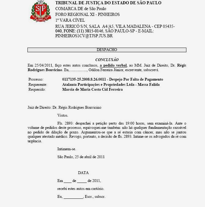 Mais um lance pitoresco no caso do Banco Santos : o despacho que autorizava Maria Costa Cid Ferreira, esposa do ex-banqueiro, a retirar da mansão bens pessoais, tinha como limite o dia de hoje. Ontem, porém, o magistrado Régis Rodrigues Bonvicino, da 1ª vara Cível de Pinheiros, proferiu despacho determinando a prorrogação do prazo até o dia 29 p.f. (clique aqui). Mas não por muito tempo : logo depois, dr. Bonvicino voltou atrás, confessando que despachou a petição perto das 19h, "sem examiná-la". Fazendo-o, como manda a cartilha, e como espera o jurisdicionado, disse que "não há qualquer fundamentação razoável no pedido de dilação de prazo" : "Argumentou-se que a ré estaria com câncer, mas não se juntou qualquer atestado médico" (clique aqui). É mole ou quer mais ? Moral da história, não vá, leitor, aparecer na 1ª vara Cível de Pinheiros perto das 19h. E, se estiver pelas redondezas, e com um pouco de fome, nossa dica para despachá-la - aqui sim sem nem precisar examinar - é o charmoso restaurante Rosa Maria, que fica duas quadras do fórum, no coração da Vila Madalena.