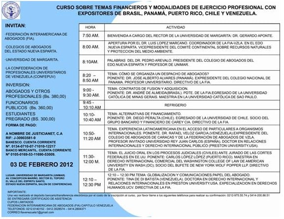 No dia 3/2, André de Almeida, do escritório Almeida Advogados e presidente da Federação Interamericana de Advogados (FIA), participará do "Curso sobre temas financeiros e as modalidades de exercício profissional", que acontecerá na Venezuela. O evento terá expositores do Brasil, Panamá, Porto Rico, Chile e Venezuela. Na ocasião, o advogado falará sobre "Fusões e Aquisições na América Latina". (Clique aqui)