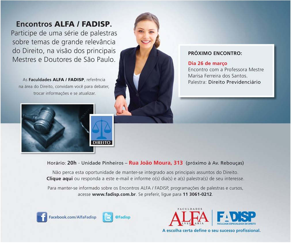 No dia 26/3, às 20h, a FADISP - Faculdade Especializada em Direito promove palestra sobre "Direito Previdenciário" com a professora Marisa Ferreira dos Santos. (Clique aqui)