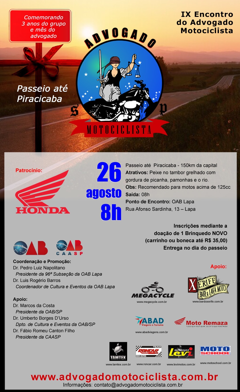 No próximo domingo, o moto clube Advogado Motociclista realiza o "IX Encontro do Advogado Motociclista", com destino a Piracicaba. O passeio acontece em comemoração ao mês do Advogado e aos 3 anos do grupo. (Clique aqui)
