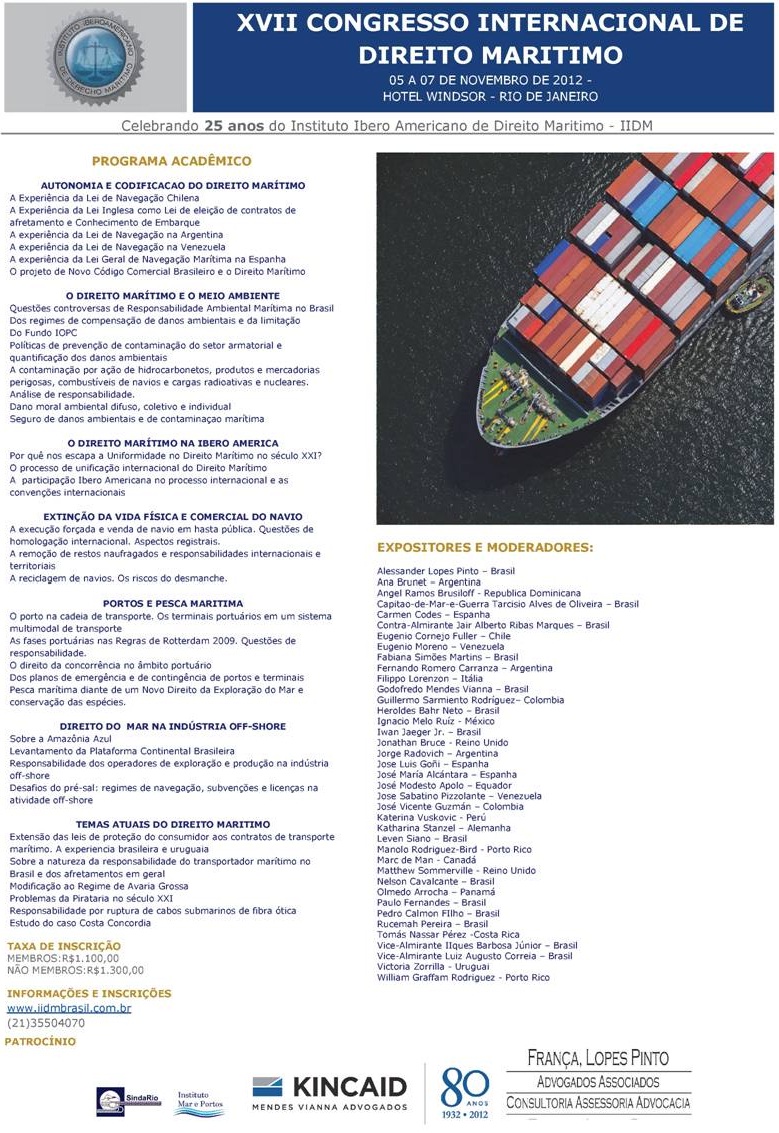 "A extensão das leis de proteção do consumidor aos contratos de transporte marítimo com exemplificação das experiências brasileiras e uruguaia" será o tema da palestra de Godofredo Mendes Vianna, do escritório Kincaid | Mendes Vianna Advogados, durante o "XVII Congresso Internacional de Direito Marítimo", no dia 7/11. Também será palestrante o advogado Iwam Jaeger Jr., sócio da banca, com a palestra "Seguro de danos ambientais e de contaminação marítima", no dia 5/11. O evento será realizado de 5 a 7/11, no Hotel Windsor, no RJ. (Clique aqui)