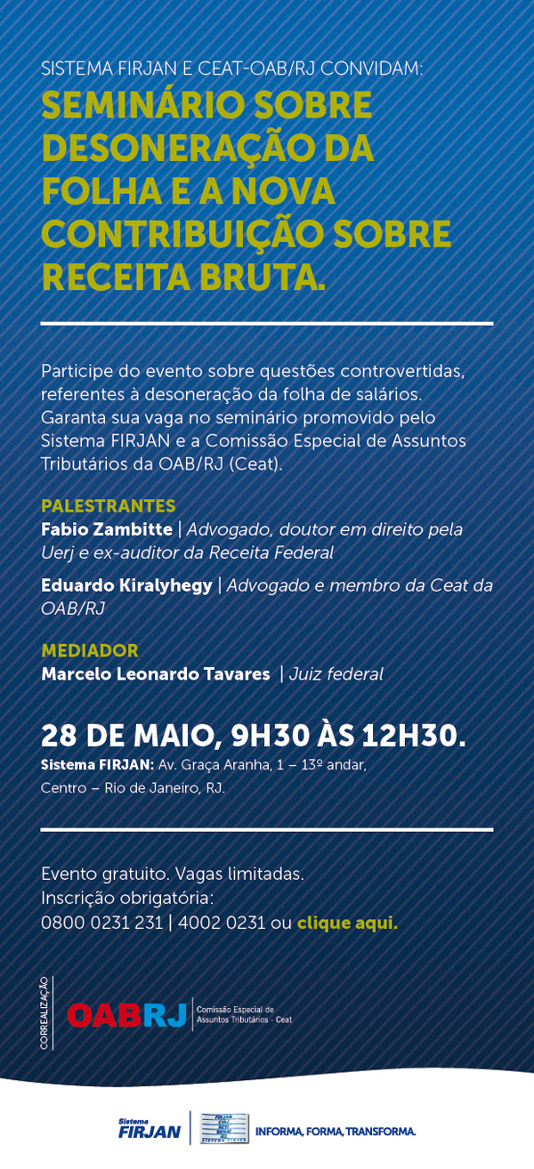 No dia 28/5, Fabio Zambitte, do escritório Luís Roberto Barroso & Associados, palestrará durante o "Seminário sobre Desoneração da Folha e a Nova Contribuição sobre Receita Bruta", promovido pelo Sistema Firjan e pela Comissão Especial de Assuntos Tributários da OAB/RJ. (Clique aqui)