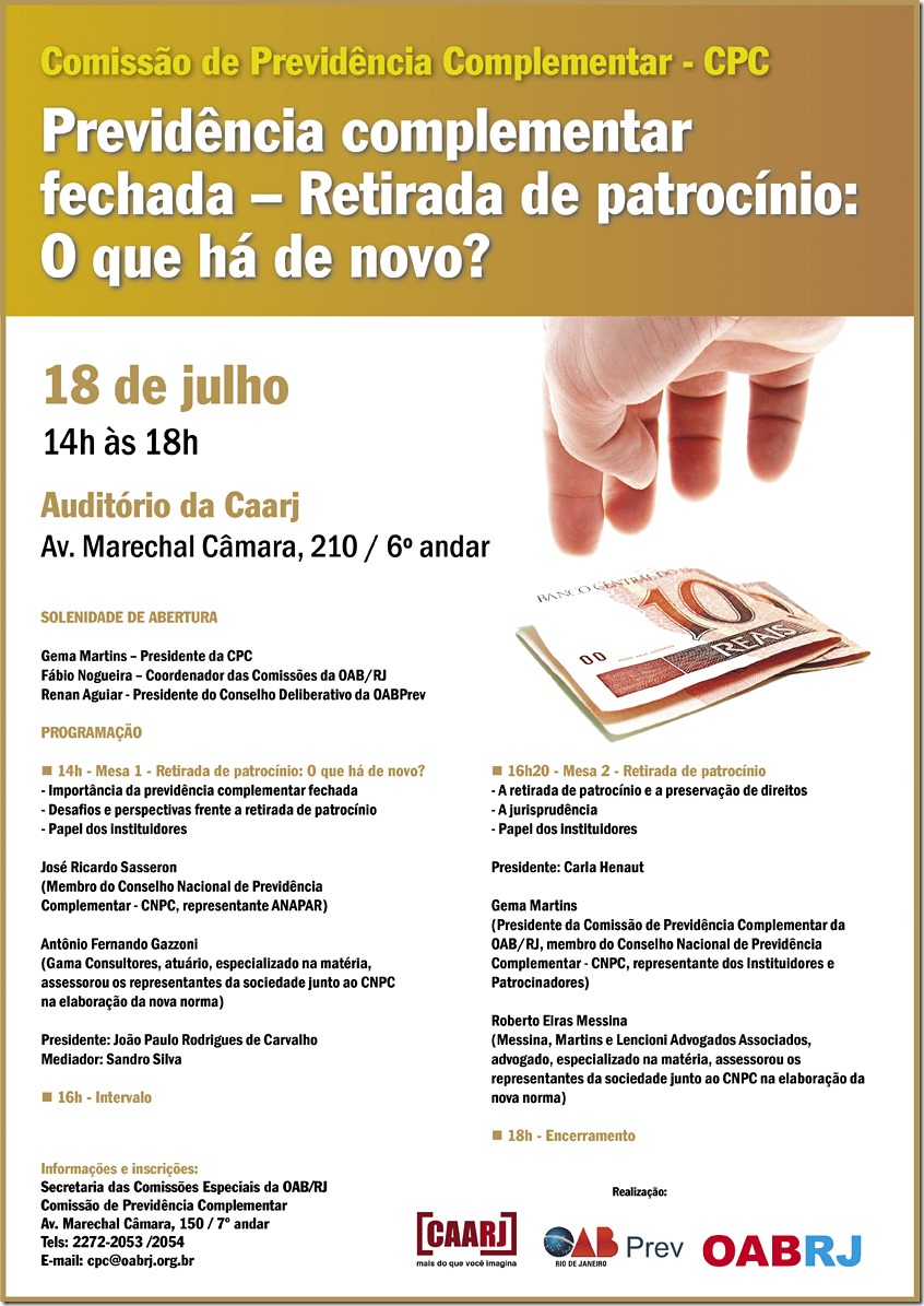 A Comissão de Previdência Complementar da OAB/RJ, a OABPrev e a CAARJ realizam o seminário "Previdência complementar fechada - Retirada de patrocínio : o que há de novo ?", hoje, a partir das 14h, no auditório da CAARJ. (Clique aqui)