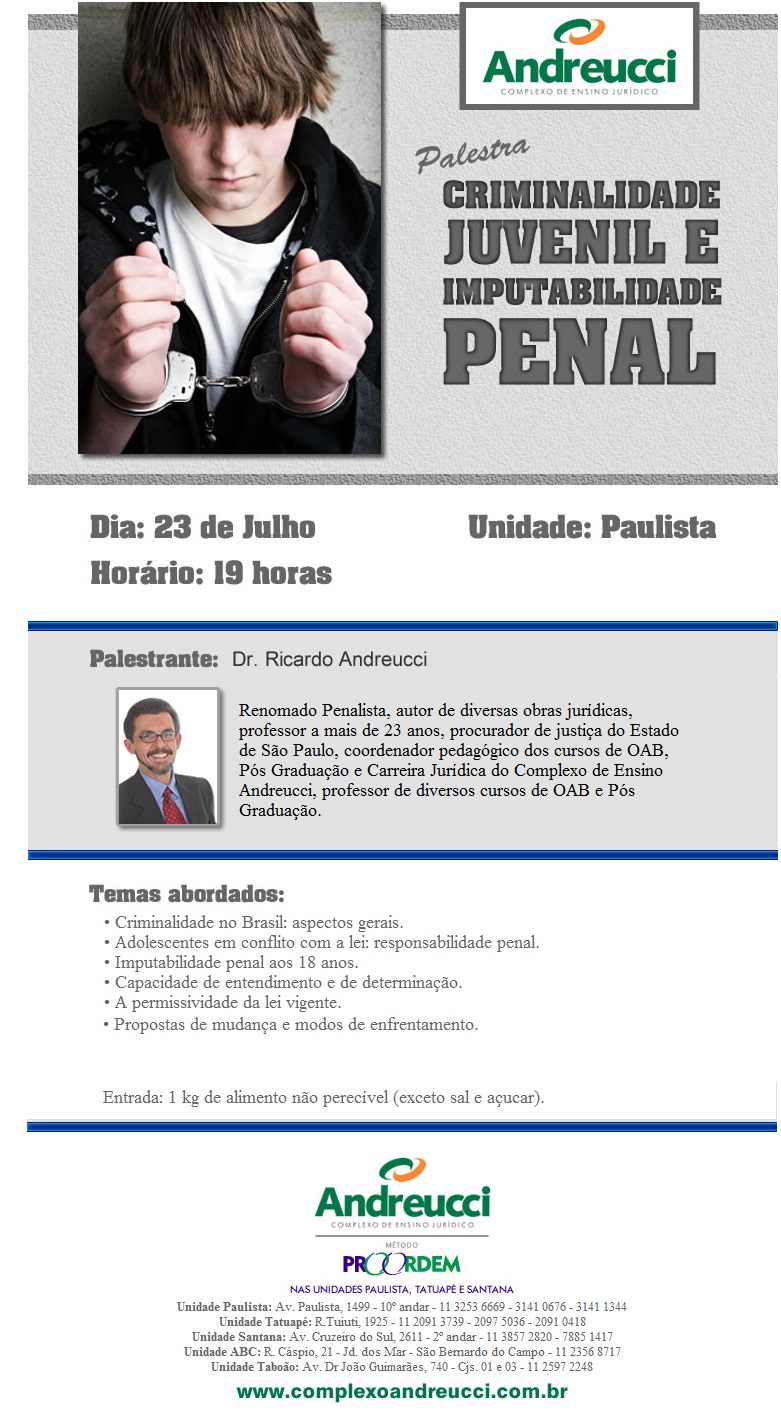O Complexo de Ensino Andreucci Proordem realizará dia 23/7, às 19h, na unidade Paulista (av. Paulista, 1499, 10º andar), palestra gratuita com o tema "Criminalidade Juvenil", que será ministrada pelo professor Ricardo Andreucci. Inscrições pelo telefone (11) 3148-2140. As vagas são limitadas. (Clique aqui)