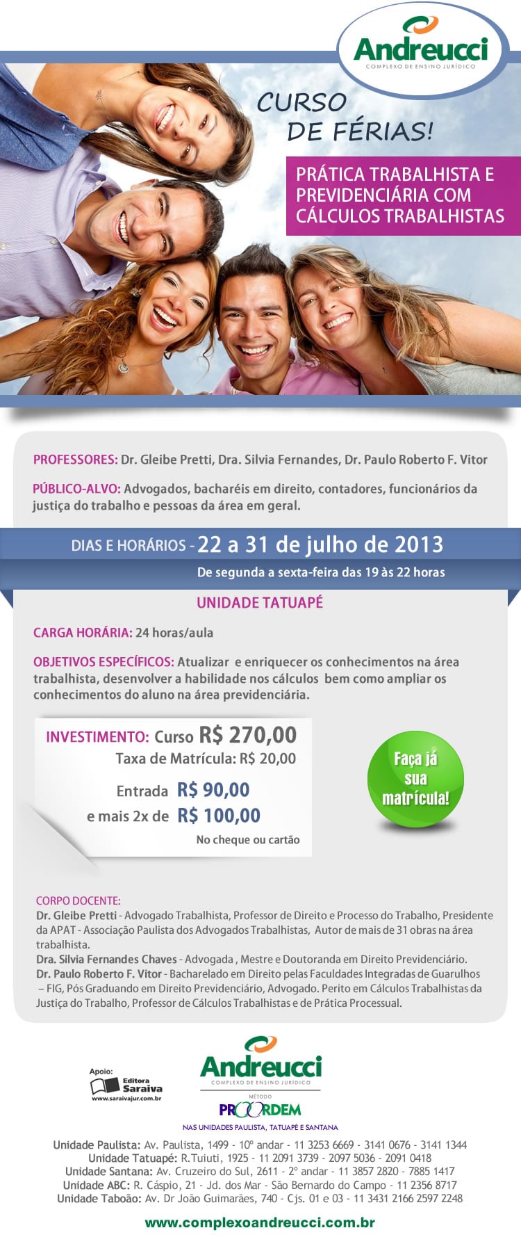 O Complexo de Ensino Andreucci Proordem realiza, de hoje a 31/7, das 19 às 22h, na unidade Tatuapé (rua Tuiuti, 1925- sobreloja), o "Curso de Prática Trabalhista, Previdenciária e Cálculos Trabalhistas", que será ministrado pelos professores Gleibe Pretti, Paulo Roberto Vitor e Silvia Fernades Chaves. Inscrições pelos telefones (11) 2097-3739 / 3141-0676 / 3857-2820. (Clique aqui)
