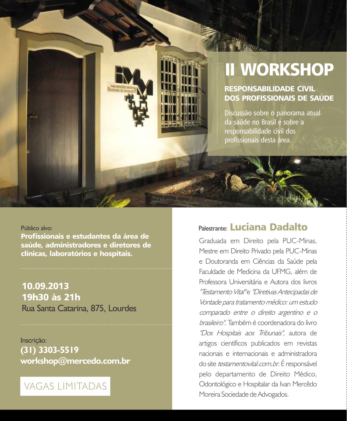 Hoje, às 19h30, o escritório Ivan Mercêdo Moreira Sociedade de Advogados realiza o segundo workshop sobre "Responsabilidade Civil dos profissionais de saúde", ministrado pela advogada Luciana Dadalto. (Clique aqui)