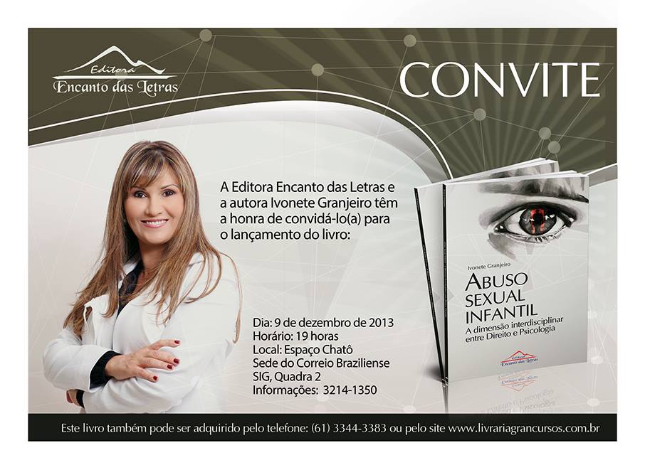 No dia 9/12, será lançado o livro "Abuso Sexual Infantil", de Ivonete Granjeiro. O evento será em Brasília, no Espaço Chatô, sede do Correio Braziliense, às 19h. (Clique aqui)