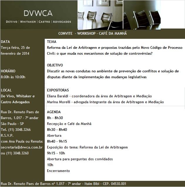 O escritório De Vivo, Whitaker e Castro Advogados promove, dia 25/2, a partir das 8h, café da manhã para convidados, no qual as advogadas da banca Eliana Baraldi e Marina Morelli ministrarão palestra sobre "Reforma da Lei de Arbitragem e propostas trazidas pelo Novo Código de Processo Civil : o que muda nos mecanismos de solução de controvérsia ?". (Clique aqui)