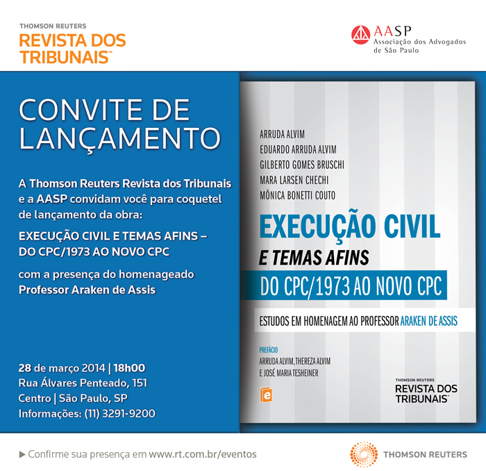 No próximo dia 28, a Thomson Reuters, por meio de seu selo editorial Revista dos Tribunais, e a AASP lançam o livro "Execução Civil e Temas Afins", de Arruda Alvim, Eduardo Arruda Alvim, Gilberto Gomes Bruschi, Mara Larsen Chechi e Mônica Bonetti Couto. O evento será em SP, na AASP, às 18h. (Clique aqui)