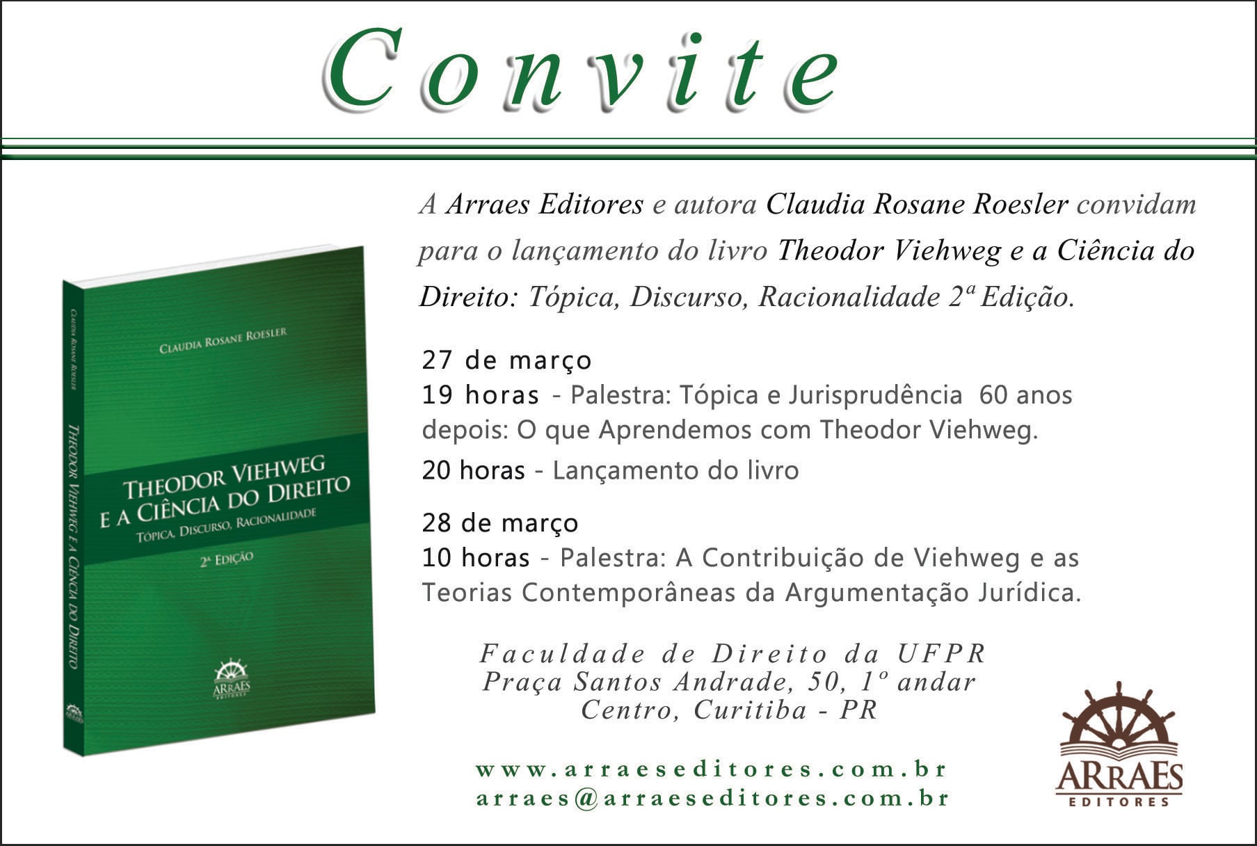 A Editora Arraes Editores lança, no próximo dia 27, a 2ª edição da obra "Theodor Viehweg e a Ciência do Direito", de Claudia Rosane Roesler. O evento será em Curitiba, na Faculdade de Direito da UFPR, às 20h. (Clique aqui)