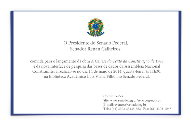 Acontece, no próximo dia 14, o lançamento da obra "A Gênese do Texto da Constituição de 1988" (Senado Federal - vls. I e II - 967p.), de João Alberto de Oliveira Lima ; Edilenice Passos ; e João Rafael Nicola. O evento será em Brasília, na Biblioteca Acadêmico Luiz Viana Filho do Senado Federal, às 11h30. (Clique aqui)