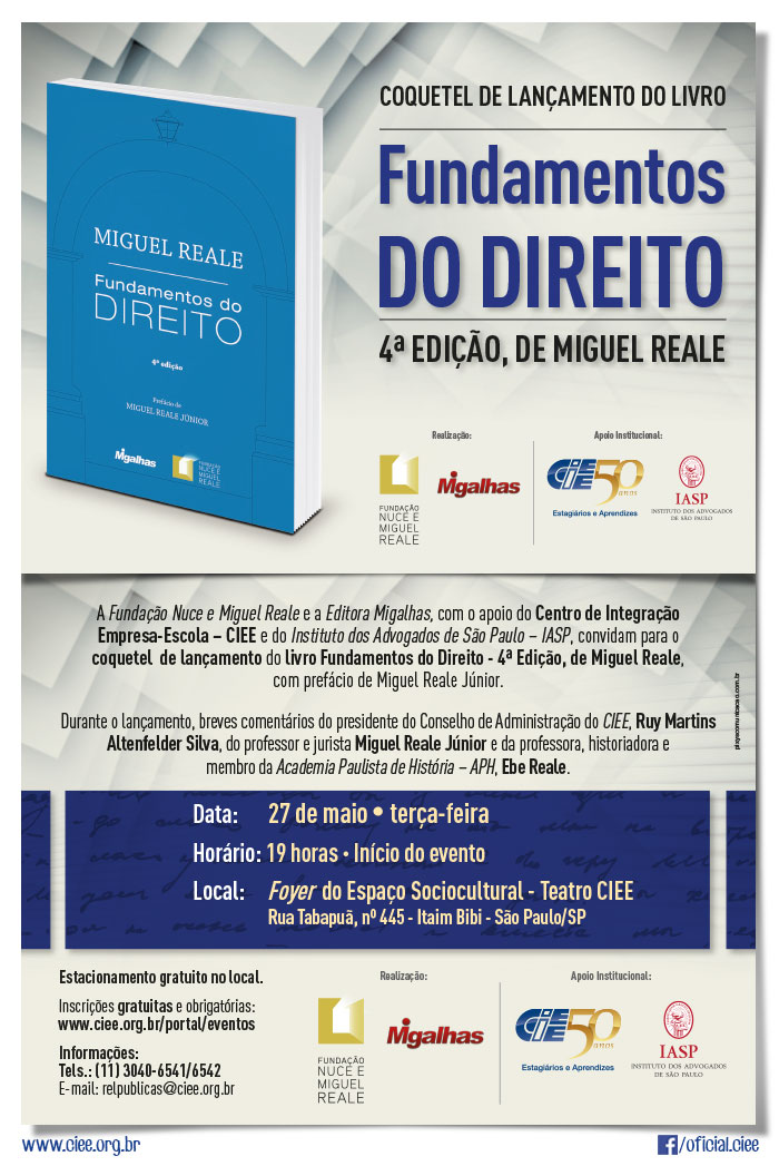 A Fundação Nuce, Miguel Reale e a Editora Migalhas, com o apoio do Centro de Integração Empresa-Escola - CIEE e do IASP - Instituto dos Advogados de São Paulo, convidam para o coquetel de lançamento do livro "Fundamentos do Direito - 4ª Edição", do mestre Miguel Reale, com prefácio de Miguel Reale Júnior. Dia 27 de maio, às 19h, em SP. Participe. (Clique aqui)