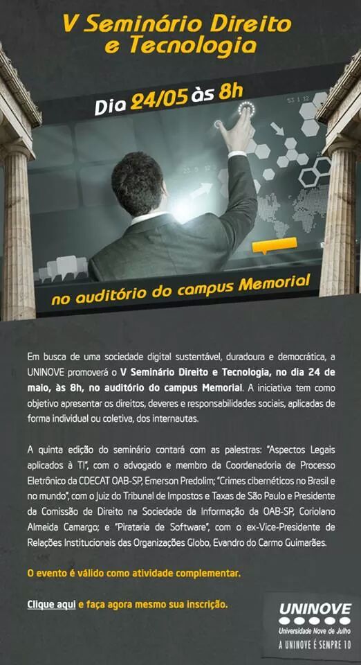 Coriolano Almeida Camargo, do escritório Almeida Camargo Advogados, palestrará amanhã durante o "V Seminário Direito e Tecnologia", na Universidade Nove de Julho - UNINOVE. (Clique aqui)