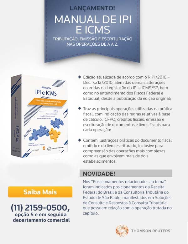 O título "Manual de IPI e ICMS" acaba de ser lançado pela Thomson Reuters, por meio de seu selo editorial FISCOSoft. (Clique aqui)