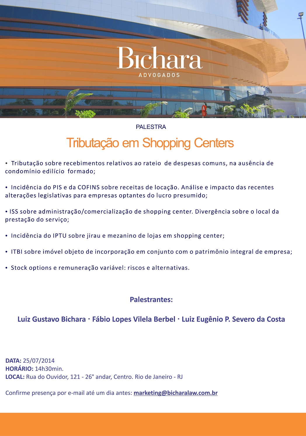 O escritório Bichara Advogados realiza hoje, às 14h30, a palestra "Tributação em Shopping Centers". Os palestrantes Luiz Gustavo Bichara, Fabio Lopes V. Berbel e Luiz Eugênio Porto Severo da Costa falarão, dentre outros assuntos, da incidência do PIS e da COFINS sobre receitas de locação e ISS sobre administração/comercialização de shopping center. (Clique aqui)