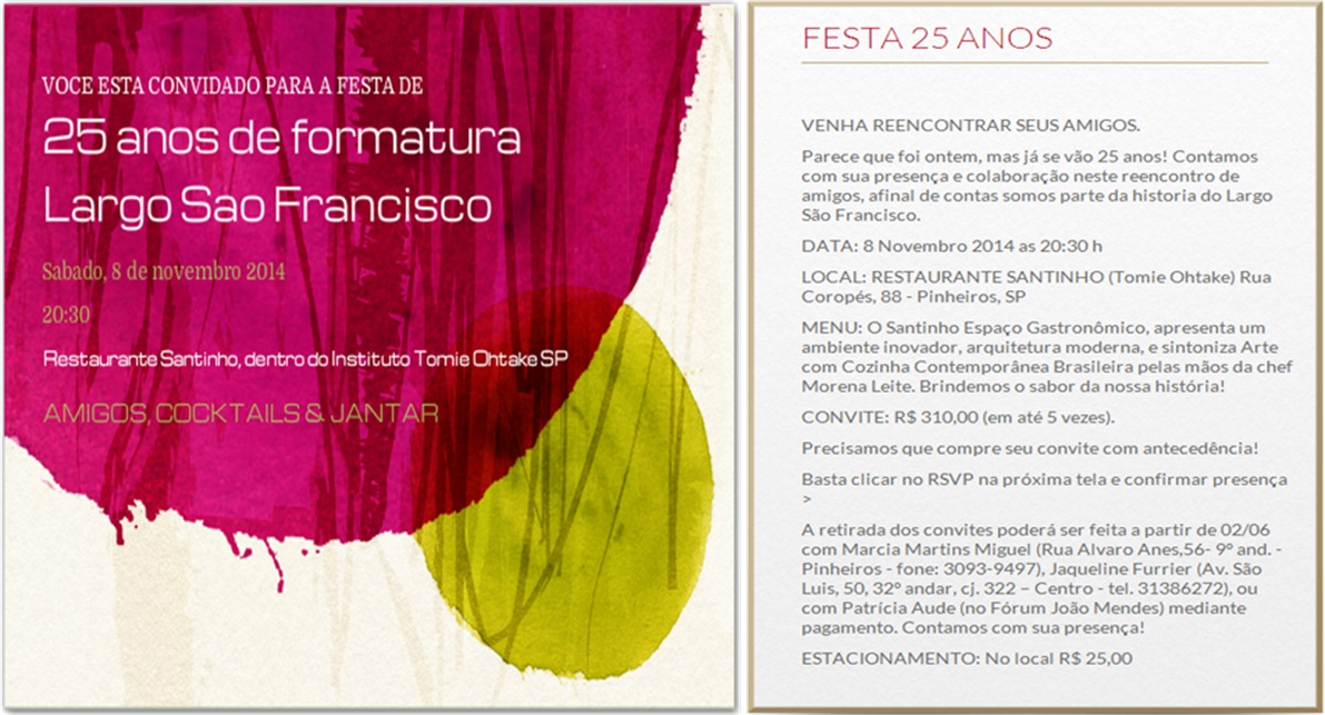 Dia 8/11, às 20h30, acontece a festa de 25 anos de formatura do Largo S. Francisco da 158º turma, de 1989, que tem no rol de acadêmicos formados nomes como Paula Andrea Forgioni, Eduardo Boccuzzi, Paulo Lucon, Miguel Pereira Neto, entre outras personalidades do Direito. (Clique aqui)