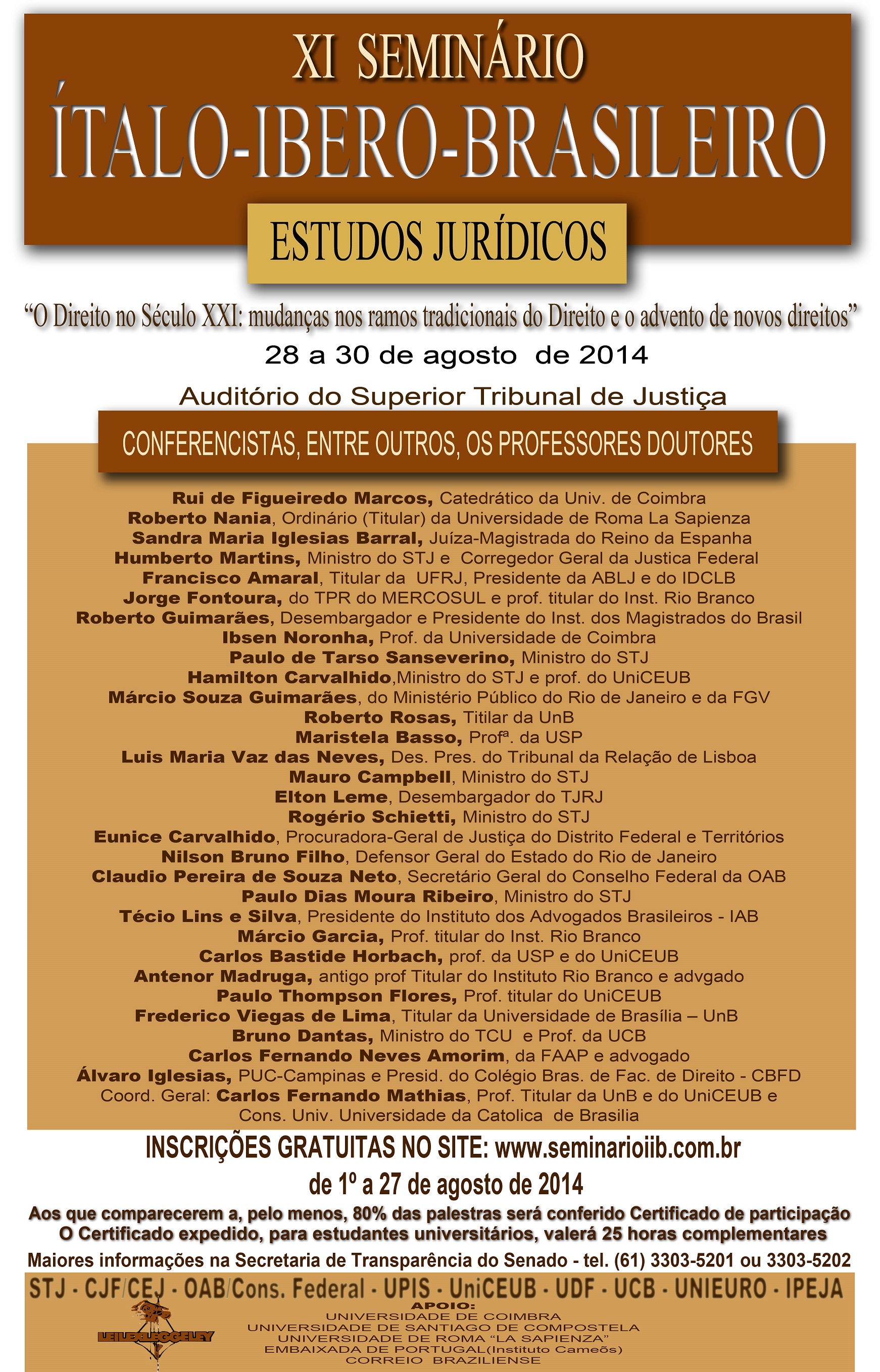 O "XI Seminário Ítalo-Ibero-Brasileiro de Estudos Jurídicos", que acontece de 28 a 30/8, no auditório do STJ, terá como tema "O Direito no século XXI : mudanças nos ramos tradicionais do Direito e o advento de novos direitos" e reunirá grandes nomes do mundo jurídico. As inscrições são gratuitas. (Clique aqui)