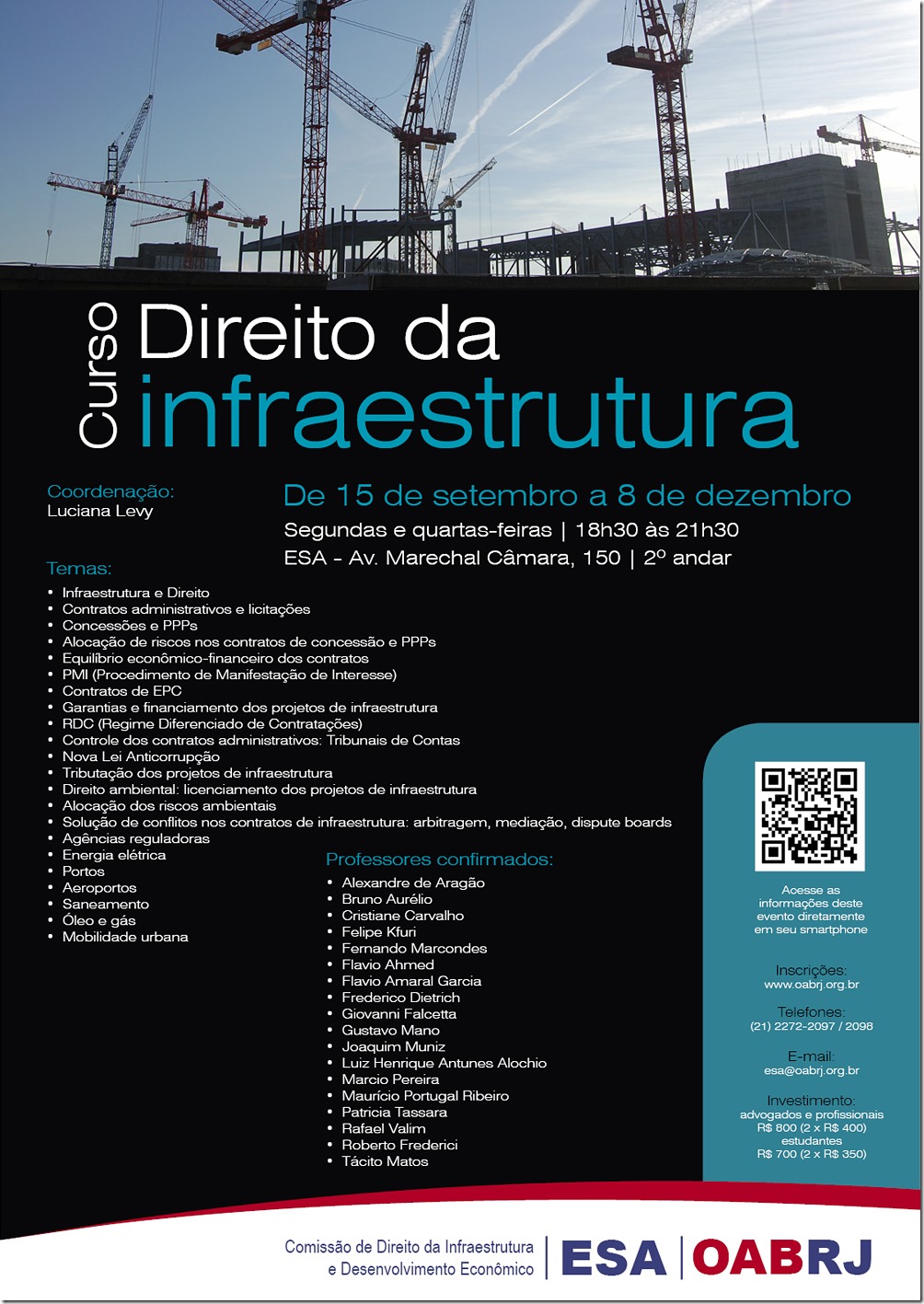 Joaquim de Paiva Muniz, do escritório Trench, Rossi e Watanabe Advogados, ministrará aula de "Arbitragem", durante o curso "Direito da Infraestrutura", que será realizado de 15/9 a 8/12, na ESA da OAB/RJ. (Clique aqui)