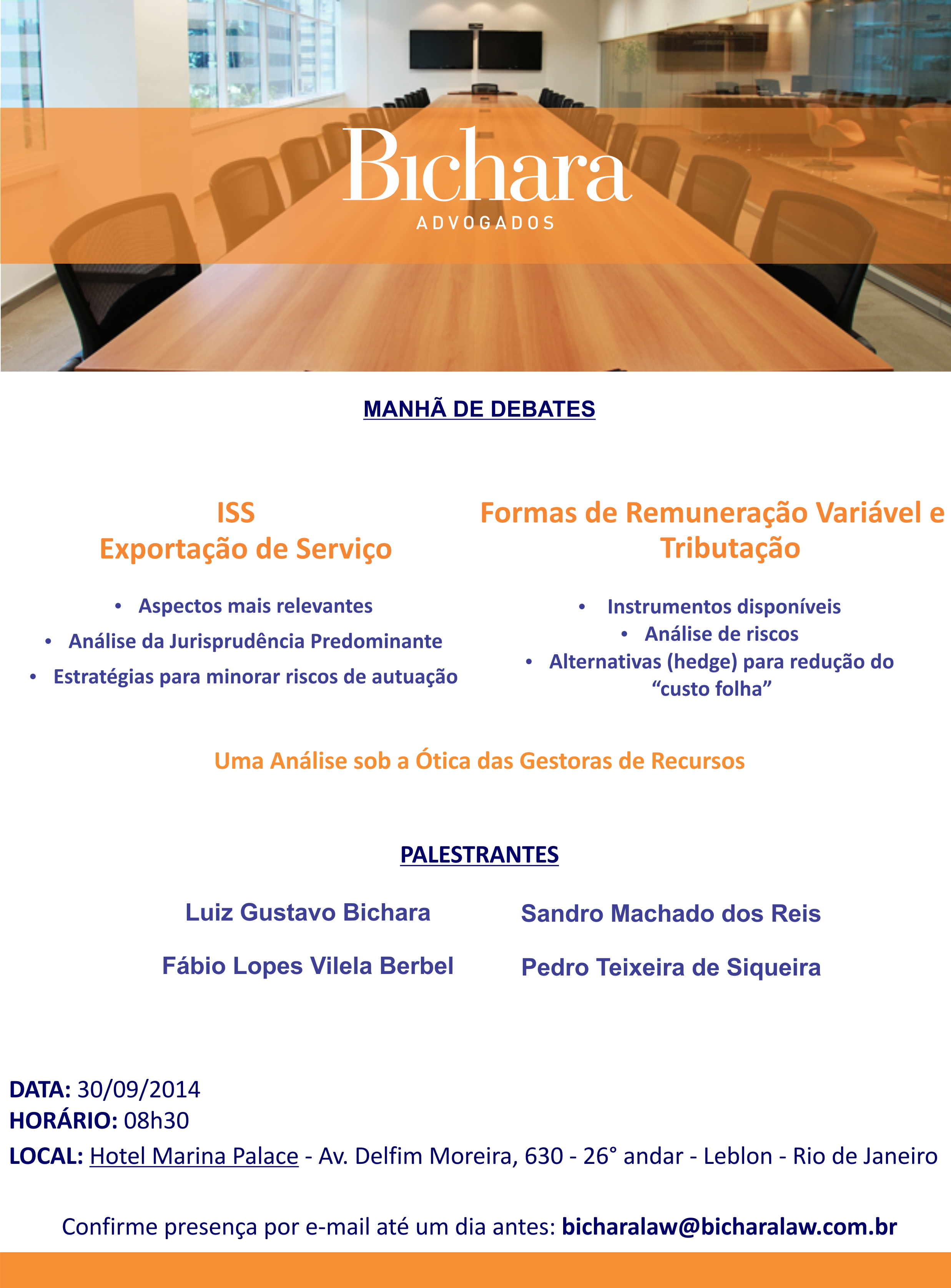 Luiz Gustavo Bichara, Sandro Machado dos Reis e Fábio Lopes Vilela Berbel, do escritório Bichara Advogados, promovem dia 30/9, às 8h30, no Hotel Marina Palace, no RJ, a palestra "ISS Exportação de Serviço e Formas de Remuneração Variável e Tributação". (Clique aqui)
