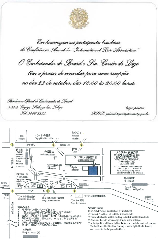 Nesta sexta-feira, terminou o encontro anual da IBA - International Bar Association, em Tóquio. A organização foi impecável. Além dos painéis de cada comitê específico, chamou a atenção o debate para "achieving justice and human rights in an era of climate disruption". Ontem, às 18h, o embaixador brasileiro e sua sra. abriram a casa (projeto encomendado pelo Estado brasileiro ao arquiteto Rui Ohtake) para os patrícios que participaram do evento. Entre os convidados, o enviado especial deste nosso poderoso rotativo (confira o convite - clique aqui). É preciso constar que nosso repórter só pôde comparecer depois de ouvir as severas admoestações da alta Direção de Migalhas quanto à indumentária, à polidez da conversa, à moderação na comida e bebida, enfim, recomendações típicas do saudoso Marcelino de Carvalho. E não poderia ser de outra forma ao participar de uma recepção na residência do neto de Oswaldo Aranha, como é, de fato, o embaixador André Aranha Corrêa do Lago.