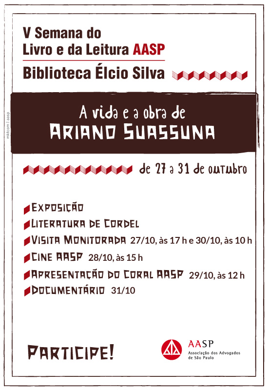 Para comemorar o dia nacional do livro, 29/10, a Biblioteca Élcio Silva da AASP promove a "V Semana do Livro e da Leitura", que terá como tema "A vida e obra de Ariano Suassuna", na sede da entidade. (Clique aqui)