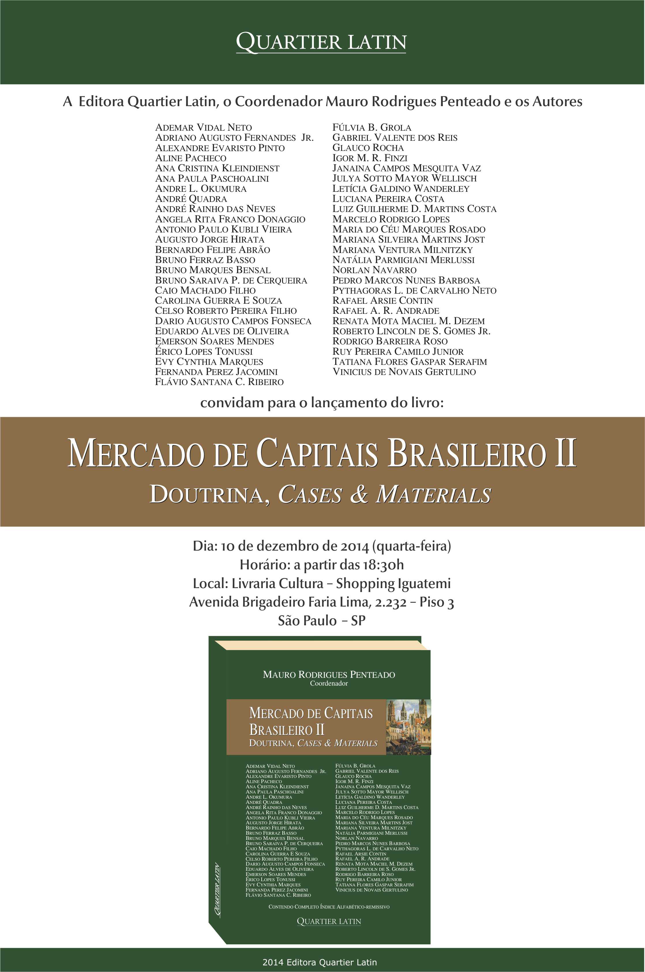 Acontece, no próximo dia 10, o lançamento do livro "Mercado de Capitais Brasileiro II - Doutrina, cases e materials", coordenado por Mauro Rodrigues Penteado, e com a coautoria de Pedro Marcos Nunes Barbosa, do escritório Denis Borges Barbosa Advogados. O evento será em SP, na Livraria Cultura do Shopping Iguatemi, às 18h30. (Clique aqui)