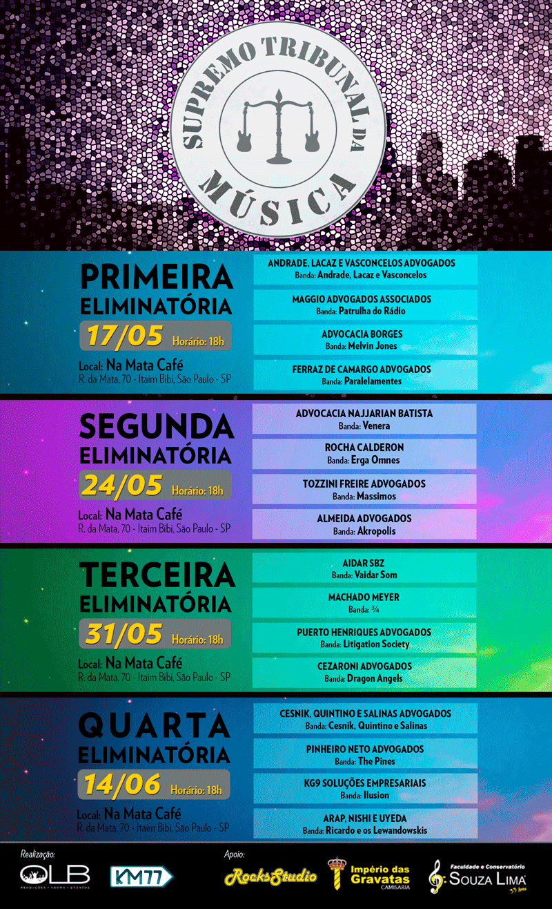No próximo domingo, 17/5, em SP, acontece a primeira eliminatória do festival de música que promove a interação entre os escritórios de advocacia. (Clique aqui)