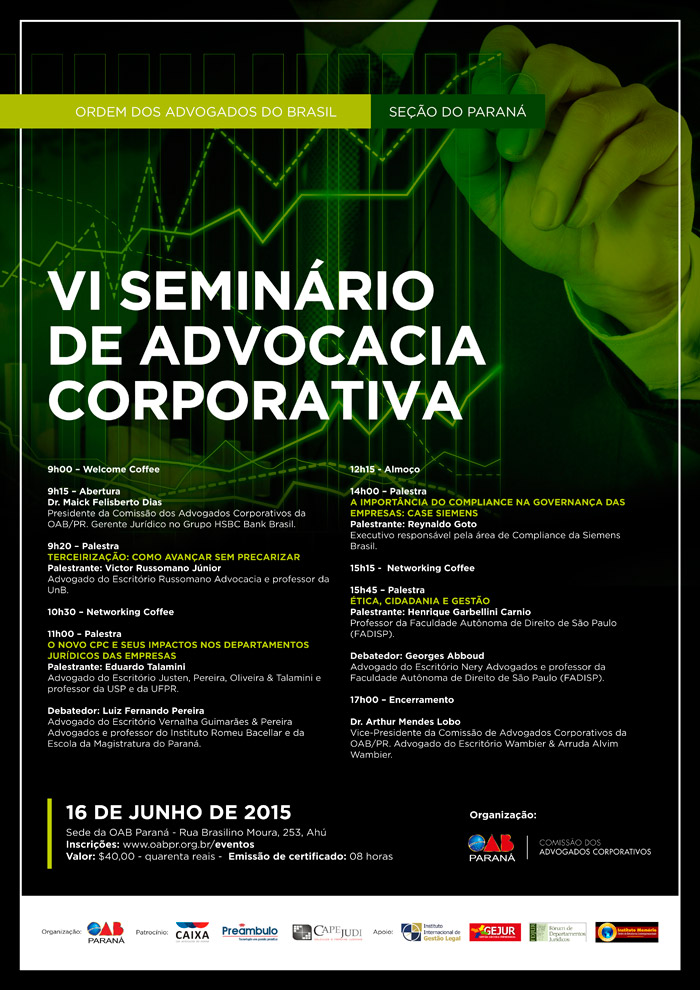 Arthur Mendes Lobo, do escritório Wambier & Arruda Alvim Wambier Advocacia e Consultoria Jurídica, fará a palestra de encerramento do "VI Seminário de Advocacia Corporativa", dia 16/6, na sede da OAB/PR (rua Brasilino Moura, 253, Ahú, Curitiba). (Clique aqui)