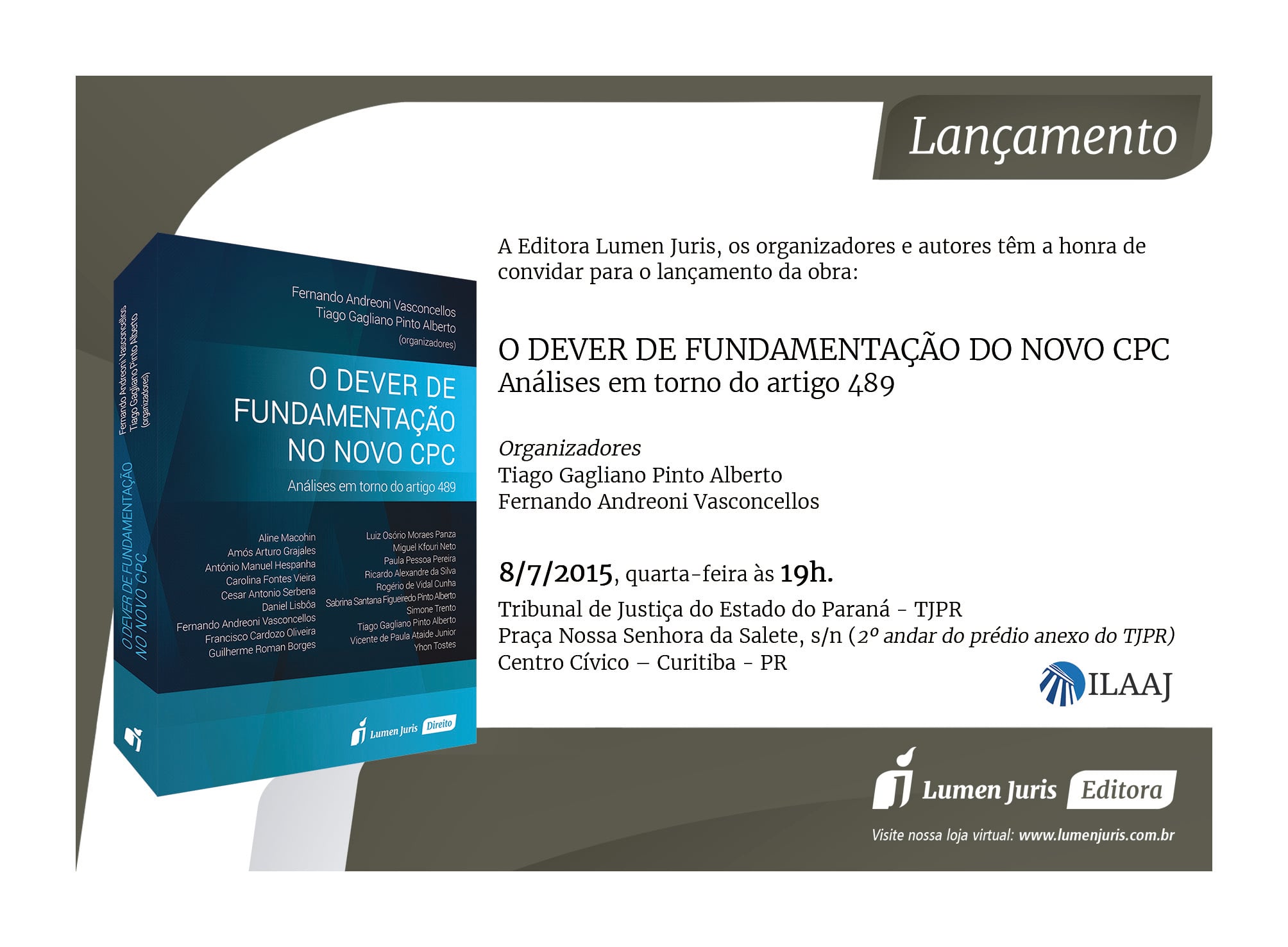 No próximo dia 8, em Curitiba, será lançada a obra "O Dever de Fundamentação no Novo CPC" (Lumen Juris), organizada por Tiago Gagliano Pinto Alberto e Fernando Andreoni Vasconcellos. O evento será no TJ/PR, às 19h. (Clique aqui)