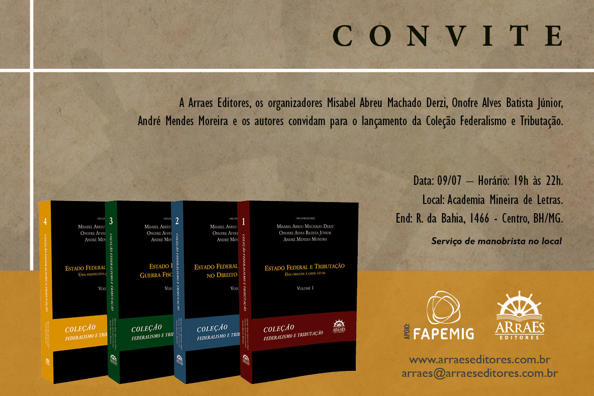 Acontece, no próximo dia 9, na Academia Mineira de Letras, em BH, o lançamento da coleção "Federalismo e Tributação" (Arraes Editores). Os professores Misabel Abreu Machado Derzi e André Mendes Moreira, sócios do escritório Sacha Calmon - Misabel Derzi Consultores e Advogados, são organizadores da coleção, juntamente com o professor Onofre Alves Batista Júnior, advogado-Geral de MG. O evento será realizado das 19 às 22h. (Clique aqui)