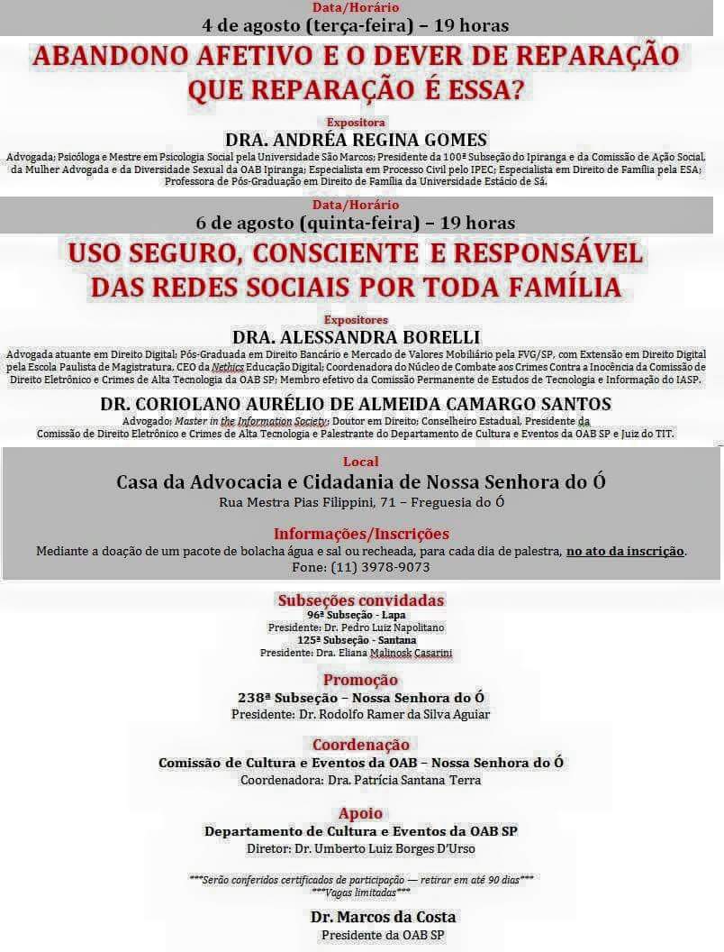 No dia 6/8, às 19h, Coriolano Almeida Camargo, do escritório Almeida Camargo Advogados, palestrará sobre "Uso seguro, consciente e responsável das redes sociais por toda família", na Casa da Advocacia e Cidadania de Nossa Senhora do Ó, em SP. (Clique aqui)