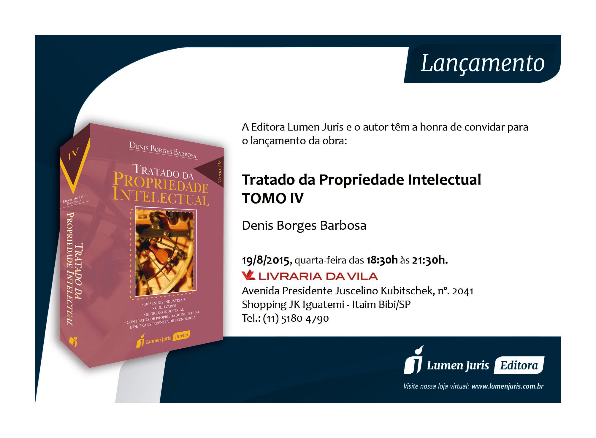 O advogado Denis Borges Barbosa, do escritório Denis Borges Barbosa Advogados, lança, no próximo dia 19, a obra "Tratado da Propriedade Intelectual" (Lumen Juris - tomo IV). O evento será em SP, na Livraria da Vila, das 18h30 às 21h30. (Clique aqui)
