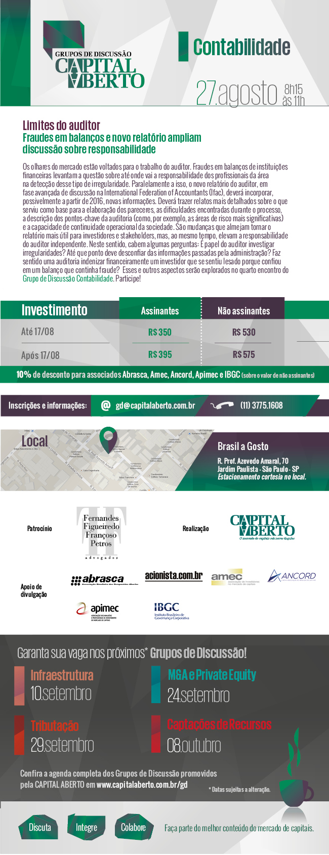 No dia 27/8, em SP, Edison Carlos Fernandes, do escritório Fernandes, Figueiredo, Françoso e Petros Advogados, palestrará sobre "Limites do auditor", no "Grupo de Discussão Capital Aberto". (Clique aqui)