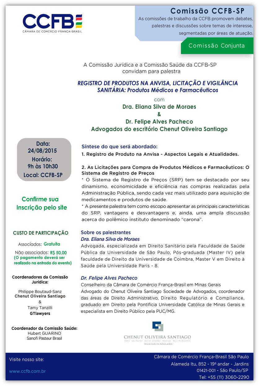 No dia 24/8, Eliana Silva de Moraes e Felipe Alves Pacheco, do escritório Chenut Oliveira Santiago Sociedade de Advogados, palestram sobre "Registro de produtos na Anvisa, licitação e vigilância sanitária : Produtos médicos e farmacêuticos", em SP. (Clique aqui)
