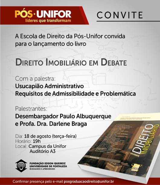 A Escola de Direito da pós-Unifor convida para o lançamento da obra "Direito Imobiliário em Debate", que tem coautoria da advogada Luciana Gurgel, do escritório Albuquerque Pinto Advogados. O evento será hoje, em Fortaleza/CE, na Unifor, às 19h. (Clique aqui)