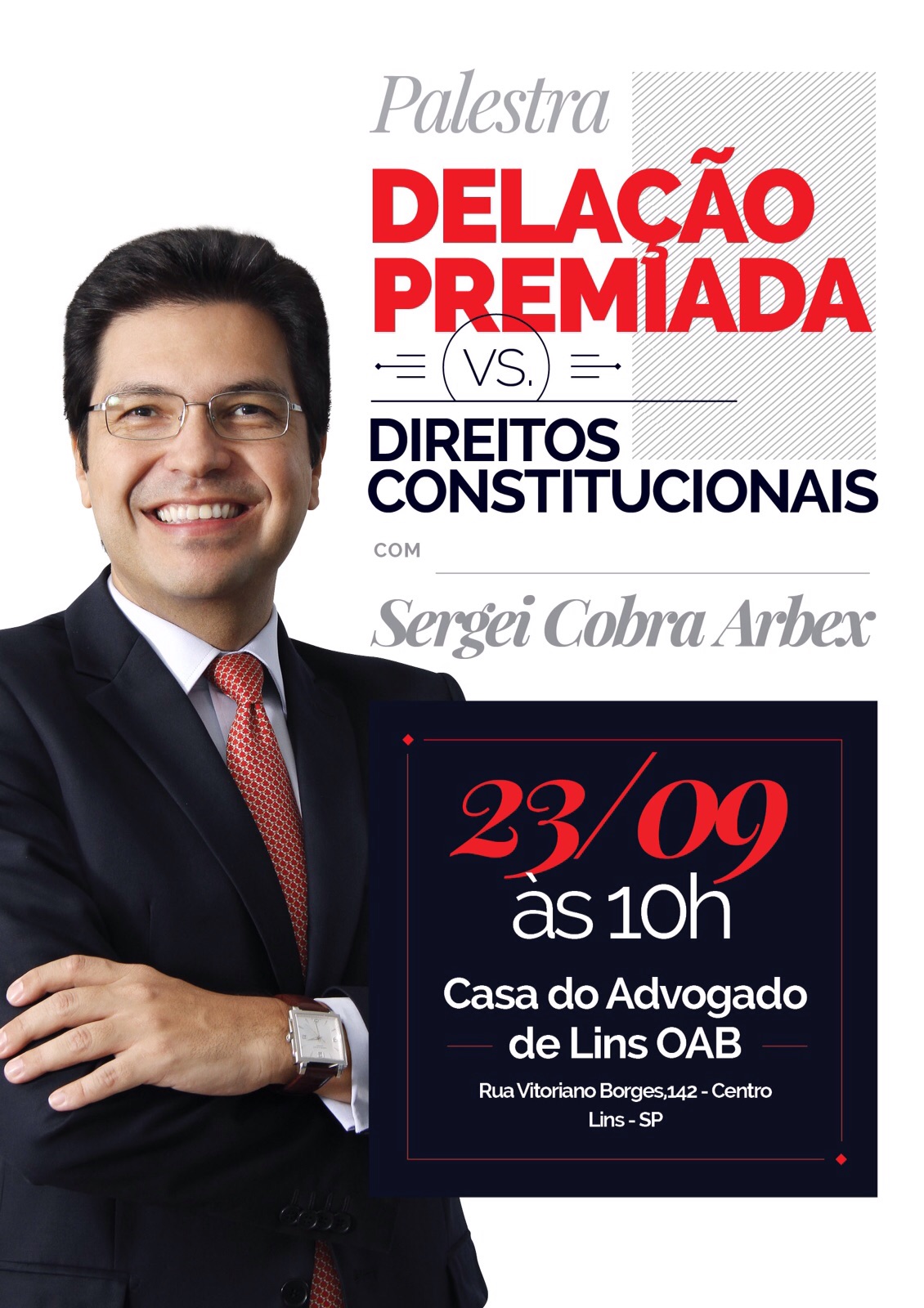 Sergei Cobra, do escritório Zulaiê Cobra Ribeiro - Sociedade de Advogados, fará palestra sobre "Delação Premiada", em Lins/SP, dia 23/9, às 10h. (Clique aqui)
