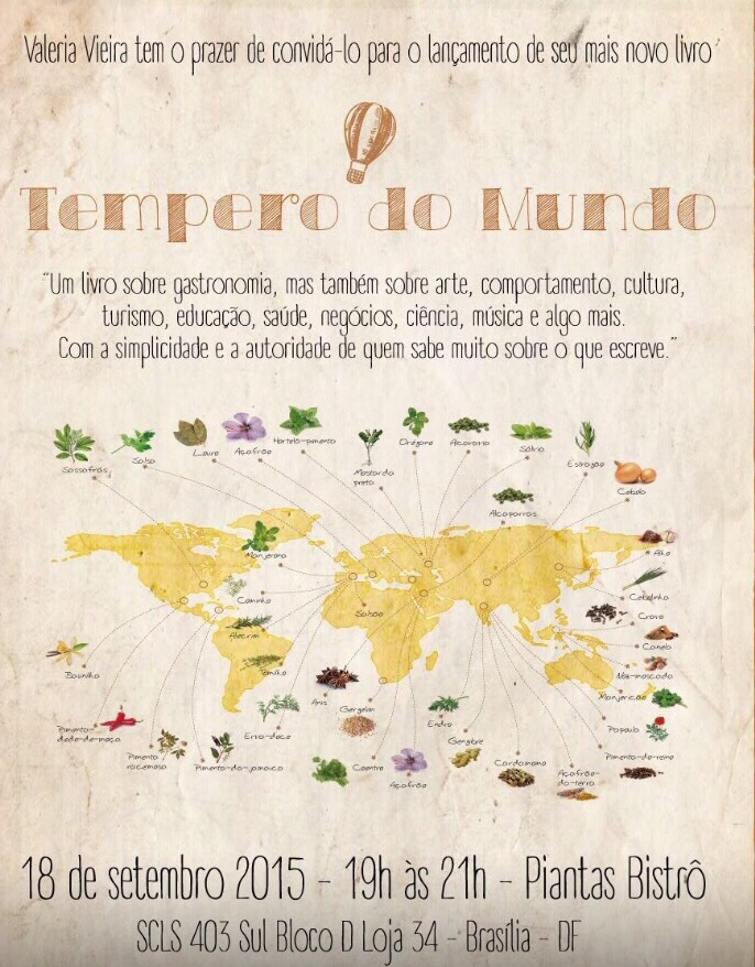 Acontece hoje o lançamento do livro "Tempero do Mundo", de Valeria Vieira. O evento será em Brasília, no Piantas Bistrô, das 19 às 21h. (Clique aqui)