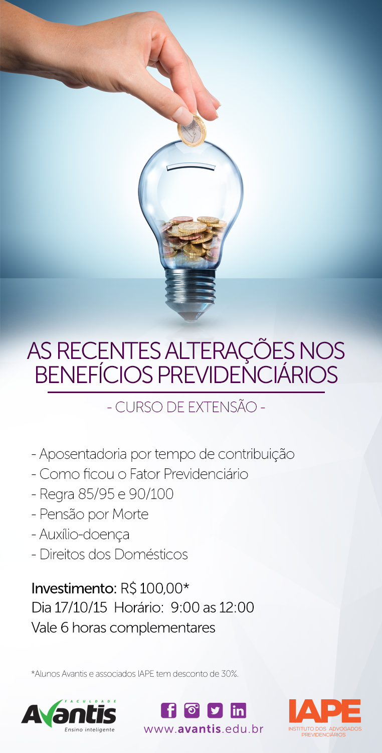 Luciana Moraes de Farias, presidente do IAPE - Instituto dos Advogados Previdenciários - Conselho Federal, estará no dia 17/10 em Balneário Camboriú para expor sobre "As Recentes Alterações nos Benefícios Previdenciários", na Faculdade Avantis. (Clique aqui)