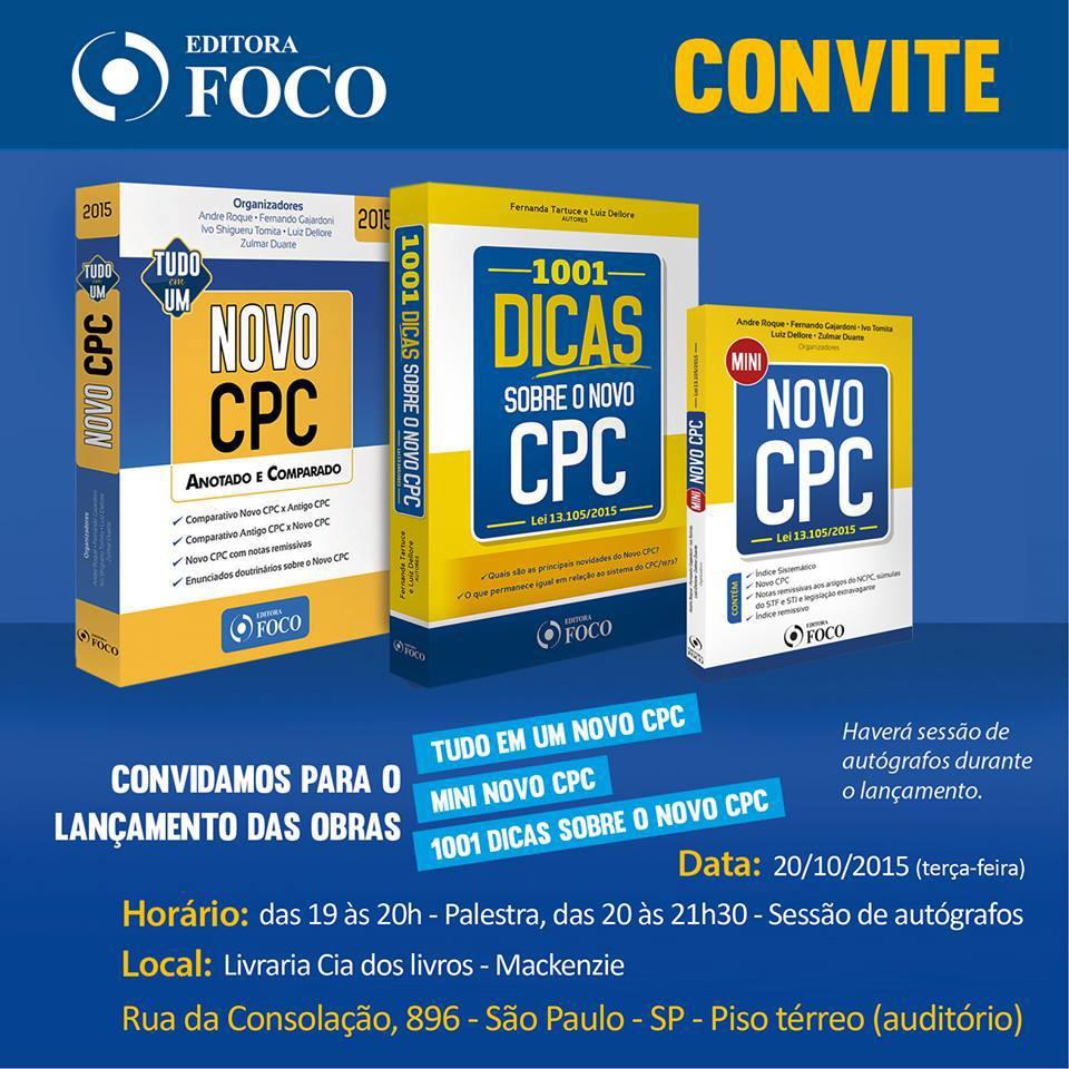 Amanhã serão lançados os livros "Novo CPC - Anotado e Comparado", "1.001 Dicas sobre sobre o Novo CPC" e "Mini Novo CPC", dos autores Andre Roque, Fernando Gajardoni, Ivo Shigueru Tomita, Luiz Dellore, Zulmar Duarte e Fernanda Tartuce. O evento será em SP, na Livraria Cia dos Livros do Mackenzie, às 19h. (Clique aqui)
